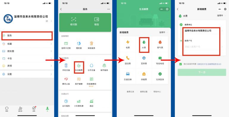 登錄微信,點(diǎn)擊右下角的“我”后然后打開(kāi)“服務(wù)”,點(diǎn)擊“生活繳費”中的“水費”,選擇“淄博市自來(lái)水有限責任公司”輸入8位數的用戶(hù)編號查詢(xún)賬單,然后核對用戶(hù)名進(jìn)行繳費。