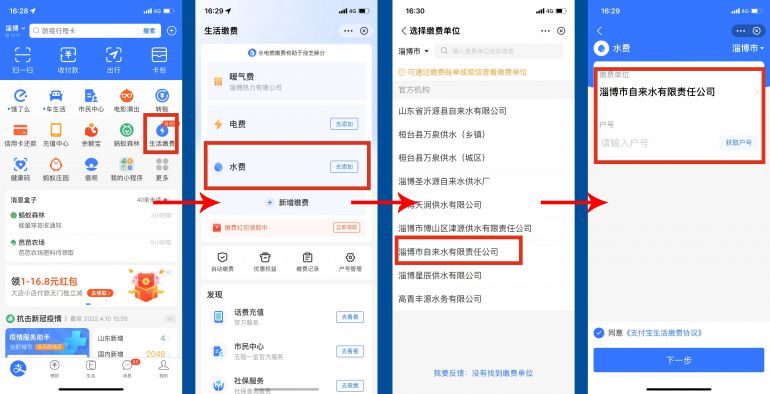 登錄支付寶,點(diǎn)擊“全部”在“便民生活”欄目里找到“生活繳費”--“水費”--機構選擇--淄博市自來(lái)水有限責任供水--輸入8位數的用戶(hù)編號查詢(xún)賬單,然后核對用戶(hù)名進(jìn)行繳費。