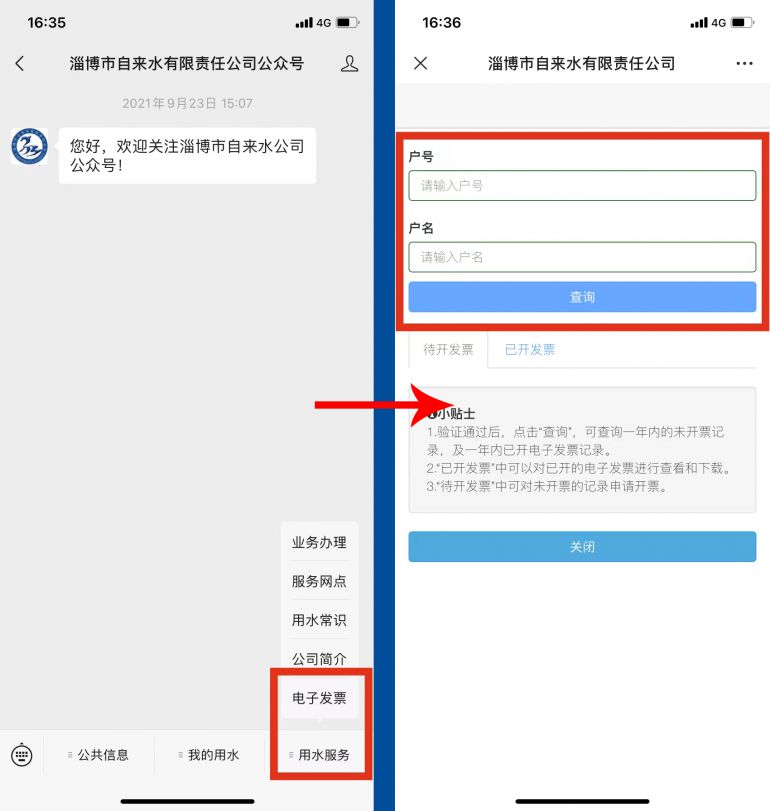 (1)進(jìn)入微信,點(diǎn)擊搜索“淄博市自來(lái)水有限責任公司公眾號”,進(jìn)入公眾號.(2)點(diǎn)擊“用水服務(wù)”菜單中的“電子發(fā)票”。(3)按提示輸入戶(hù)號、戶(hù)名,點(diǎn)擊查詢(xún)進(jìn)行驗證。若填寫(xiě)信息錯誤,系統會(huì )給出相應提示。注意:戶(hù)名和戶(hù)號兩項都需填寫(xiě)。驗證通過(guò)后,點(diǎn)擊“查詢(xún)”,可查詢(xún)一年內的未開(kāi)票記錄,及一年內已開(kāi)電子發(fā)票記錄。點(diǎn)擊“已開(kāi)發(fā)票”,可以對已開(kāi)的電子發(fā)票進(jìn)行查看和下載;點(diǎn)擊“待開(kāi)發(fā)票”,可對未開(kāi)票的記錄申請開(kāi)票。