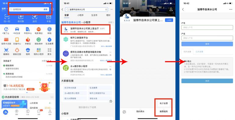 (1)進(jìn)入支付寶APP,在上方搜索欄輸入“淄博市自來(lái)水公司”,進(jìn)入“淄博市自來(lái)水公司掌上營(yíng)業(yè)廳”(2)點(diǎn)擊“繳費服務(wù)”中的“電子發(fā)票”。(3)進(jìn)入電子發(fā)票模塊后,先輸入“戶(hù)號”以及“戶(hù)名”進(jìn)行驗證,若填寫(xiě)信息錯誤,系統會(huì )給出相應提示。注意:戶(hù)名和戶(hù)號兩項都需填寫(xiě)。(4)驗證通過(guò)后,點(diǎn)擊“查詢(xún)”,可查詢(xún)一年內的未開(kāi)票記錄,及一年內已開(kāi)電子發(fā)票記錄。點(diǎn)擊“已開(kāi)發(fā)票”,可以對已開(kāi)的發(fā)票進(jìn)行查看和下載;點(diǎn)擊“待開(kāi)發(fā)票”,可對未開(kāi)票的記錄申請開(kāi)票。