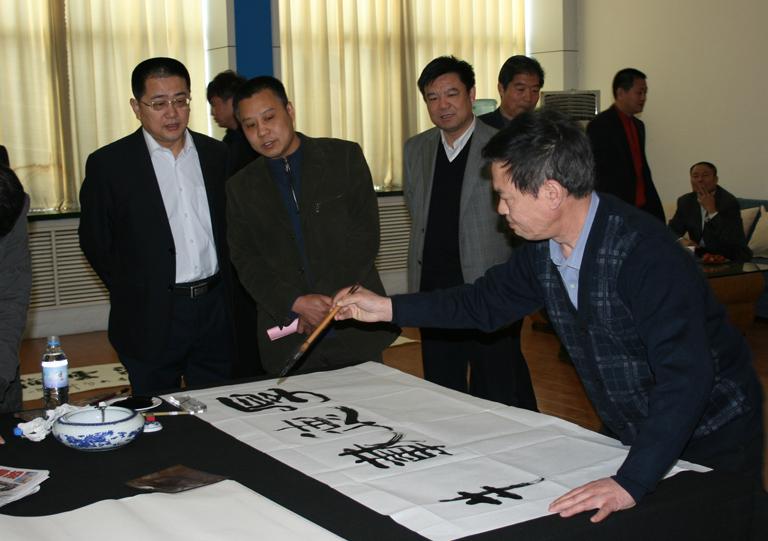 市水利局黨委書(shū)記、局長(cháng)王永勝(左三),公司經(jīng)理、黨委書(shū)記王艷明(左一)等領(lǐng)導在觀(guān)摩書(shū)法家進(jìn)行藝術(shù)創(chuàng )作