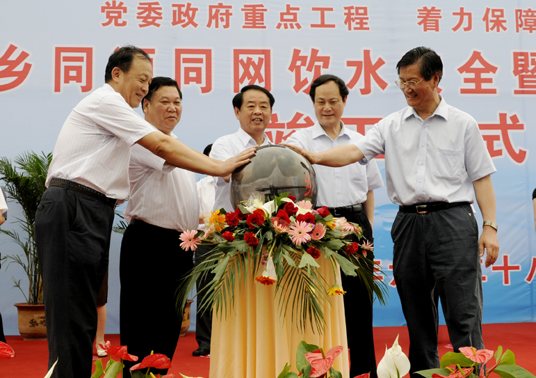 ????在中國共產(chǎn)黨成立90周年的喜慶日子里,6月28日上午,淄博市城鄉同源同網(wǎng)飲水安全暨引太入張供水工程竣工儀式在新建成的灃水凈水廠(chǎng)隆重舉行。市委副書(shū)記、市長(cháng)周清利,市委常委、紀委書(shū)記趙啟全,市人大常委會(huì )副主任曹在堂,副市長(cháng)劉有先,市政協(xié)副主席高峰嶺出席竣工儀式并共同按動(dòng)工程竣工觸摸球。市政府黨組成員鄒光平、市政府秘書(shū)長(cháng)蒲緒章出席竣工儀式。