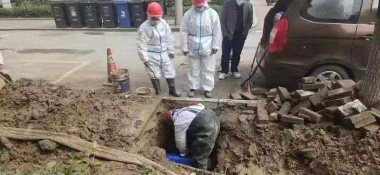 8:46,高軍到達現場(chǎng),迅速察看漏水情況,發(fā)現12號樓東側的花磚下不斷有清水涌出,與物業(yè)有關(guān)人員溝通現場(chǎng)管線(xiàn)等有關(guān)情況后,初步判斷是PE160小區主管線(xiàn)漏水。遂立即組織施工隊伍進(jìn)行搶修,并告知小區物業(yè)人員通知小區居民做好停水準備,同時(shí)將有關(guān)情況報告公司供水服務(wù)熱線(xiàn)工作人員。10:50左右,由于漏水泄壓,部分高層居民住戶(hù)家中陸續開(kāi)始出現停水現象,小區網(wǎng)格員、公司用水服務(wù)信息員及時(shí)通過(guò)網(wǎng)格微信群等發(fā)布有關(guān)信息,告知搶修情況,請居民耐心等待恢復供水。12:30漏點(diǎn)完全挖出,1米多高的水柱瞬間噴涌而出……