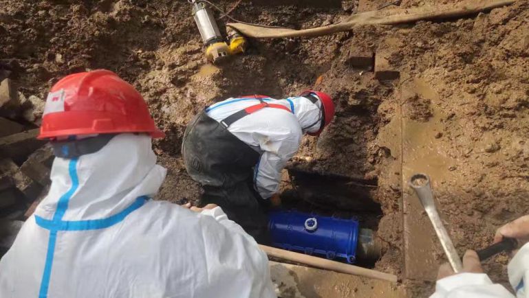 由于該管道是小區主管線(xiàn),壓力高漏水量大,搶修人員只能關(guān)閉位于人民路上的小區供水主閥門(mén),并立即用哈夫節進(jìn)行快速管道修復。經(jīng)過(guò)搶修人員4個(gè)多小時(shí)的連續奮戰,13:16管道修復完成開(kāi)閥送水,比預計時(shí)間大幅提前。