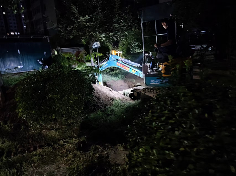 時(shí)間在一分一秒流失,已進(jìn)行了三輪管線(xiàn)漏點(diǎn)排查。23:30,按集團安排部署,現場(chǎng)確定在南北區連接的主管線(xiàn)上加裝閥門(mén),將南北區斷開(kāi),一是再次縮小排查范圍,二是確定漏點(diǎn)后減小停水范圍。8月5日早5:30,施工人員將南北連接的部分過(guò)路主管線(xiàn)挖出,10:20,過(guò)路管線(xiàn)完成閥門(mén)加裝,實(shí)現了南、北兩區分開(kāi)獨立供水。經(jīng)現場(chǎng)人員不懈努力,巡測到北區過(guò)路管線(xiàn)上可能存在漏點(diǎn),對不受影響的陽(yáng)光花園南區及時(shí)恢復了供水。天氣炎熱,為縮短用戶(hù)家中停水時(shí)間,在集團部署調度下研究確定了在漏損的110PE管內穿63PE管,在短時(shí)間內滿(mǎn)足用戶(hù)用水需求的施工方案。