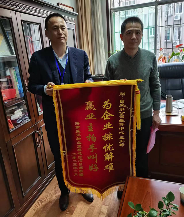 近日,恒興里程花園物業(yè)管理服務(wù)中心負責人專(zhuān)程來(lái)到淄博市自來(lái)水有限責任公司,送上一面“為企業(yè)排憂(yōu)解難 贏(yíng)業(yè)主拍手叫好”的錦旗和一封感謝信,對張店分公司維修中心黨員王玉琦同志快速、暖心的服務(wù)表示感謝。