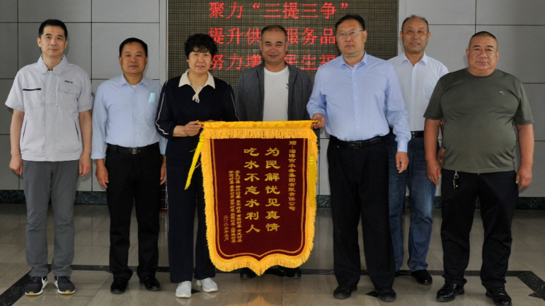 5月30日,傅家鎮蘇孔村等村委代表將寫(xiě)有“為民解憂(yōu)見(jiàn)真情 吃水不忘水利人”的錦旗送到淄博市自來(lái)水有限責任公司,表達對市水務(wù)集團及自來(lái)水公司一心為民,著(zhù)力解決村民飲用水安全問(wèn)題的誠摯感謝。
