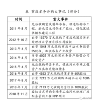 一方面,重慶水務(wù)多次以股權方式橫向并購市內外污水處理廠(chǎng)、供排水廠(chǎng)、水務(wù)公司等,提升供排水市場(chǎng)占有率;另一方面,縱向并購供排水管網(wǎng)類(lèi)資產(chǎn),加強廠(chǎng)網(wǎng)一體化建設,布局水務(wù)全產(chǎn)業(yè)鏈業(yè)務(wù),創(chuàng )新水務(wù)發(fā)展模式。
