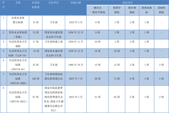 我國第一個(gè)飲用水水質(zhì)標準于1955年頒布,該標準規定了15項指標,基本構建了我國飲用水衛生標準中的感官及一般化學(xué)指標、毒理學(xué)指標、微生物指標、以及消毒劑指標的體系架構。經(jīng)1976年、1985年、2006年、2022年四次修訂,水質(zhì)指標調整至97項,其中常規指標43項,擴展指標54項。即將執行的新標準是基于我國近些年的飲用水監測、檢測和調查數據,在國內外關(guān)于污染物健康效應最新研究成果的基礎上,采用了健康風(fēng)險評估的技術(shù)方法,同時(shí)考慮了我國的實(shí)際情況和管理要求而進(jìn)行修訂的。
