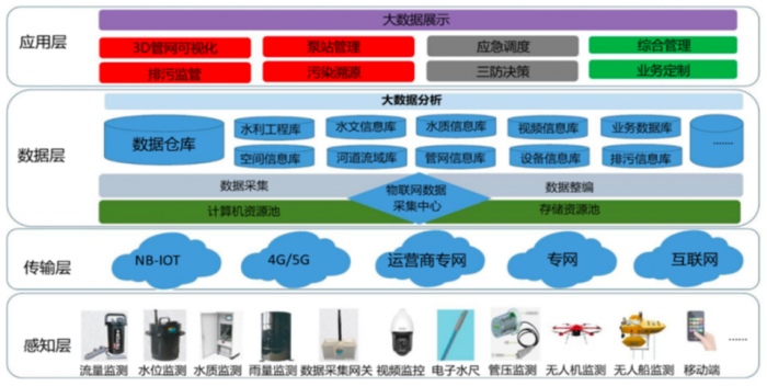 橫向來(lái)看,水務(wù)涉及水源水體 、供水、污水處理、管網(wǎng)、受納水體等多個(gè)細分領(lǐng)域;縱向來(lái)看,智慧水務(wù)分為感知層、傳輸層、數據層、應用層等多個(gè)層級。在應用層面,主要涵蓋自動(dòng)監測+數據處理+分析預警+三維展示+輔助決策+指揮調度+排口監督+績(jì)效評估+協(xié)同治理共九大功能。