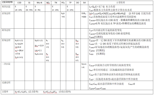 上表是7個(gè)污水處理最常用的供應單元及相應供水原理。涉及6種反應器,包括初沉池、厭氧、缺氧、好氧、二沉池、過(guò)濾等六道工序;有7個(gè)水質(zhì)參數、6個(gè)運行參數、6個(gè)動(dòng)力學(xué)參數、8個(gè)校準系數,還有19個(gè)計算方程。表中最右邊一列是計算方程的原理描述。