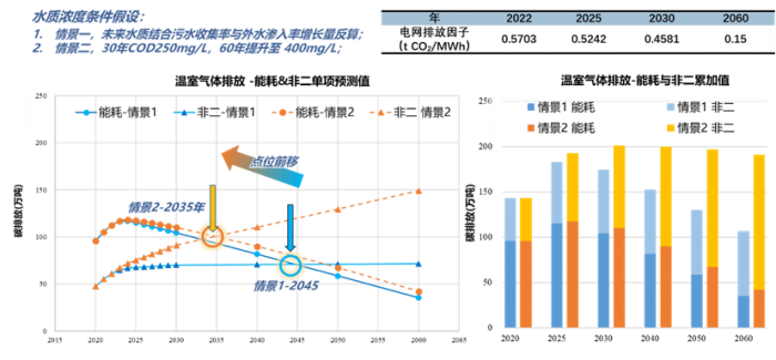 唐曉雪、王文愷等北控研究團隊,量化評估了進(jìn)水濃度提升對水務(wù)企業(yè)碳排放的影響,結果顯示在常規情景下隨著(zhù)電力因子的不斷降低,非二氣體對水廠(chǎng)碳排放影響逐步提升至2045年超過(guò)電力能耗帶來(lái)的碳排放,而當發(fā)生高濃度情景時(shí)(即由于化糞池的取消及管網(wǎng)控制導致進(jìn)水COD到2030年上升至250 mg/L;2060年上升至400mg/L),非二氣體影響將被進(jìn)一步強化,到2035年超過(guò)電力能耗帶來(lái)的碳排放,成為水務(wù)企業(yè)最重要的碳排放源。